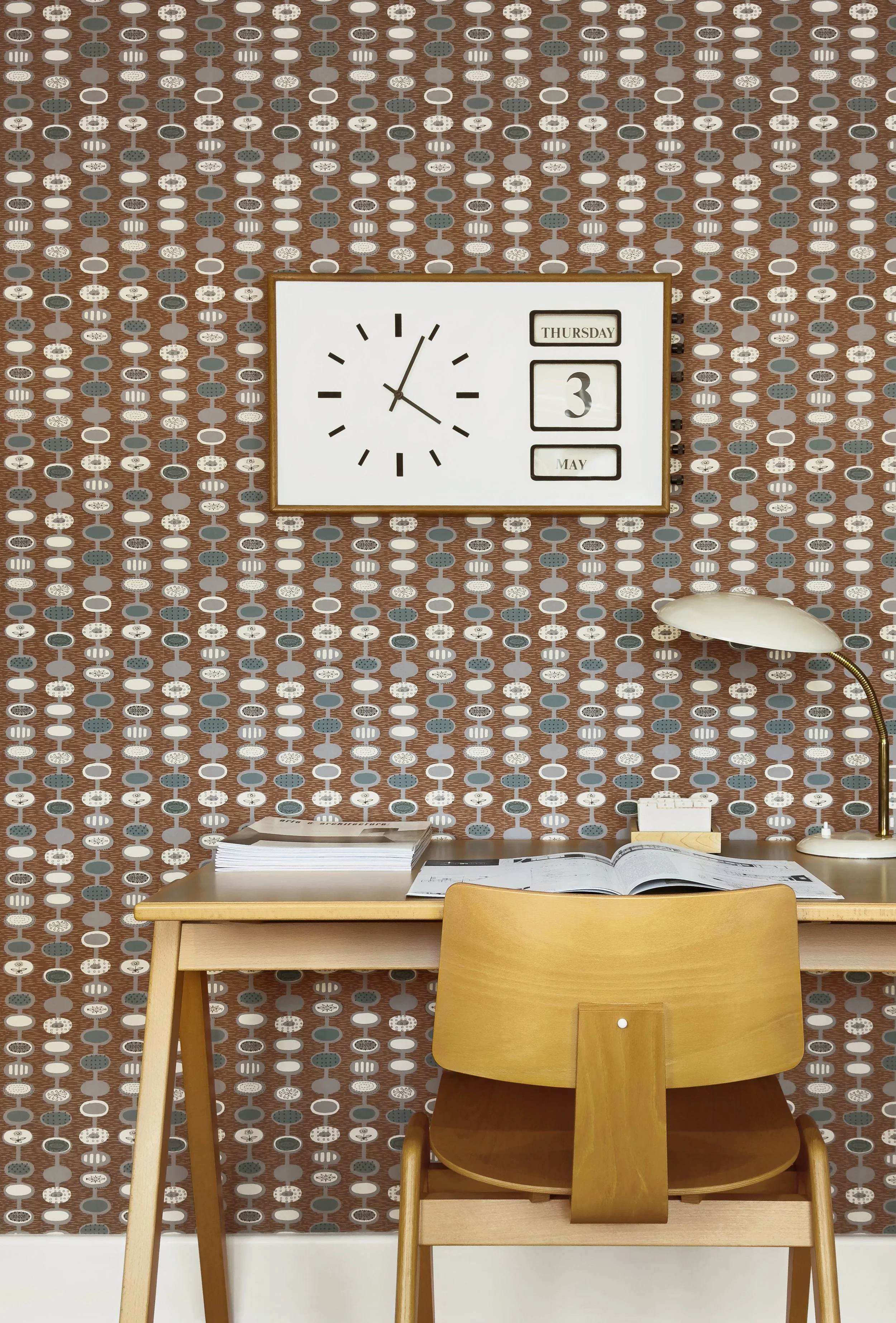 Featuring a mix of abstract and botanical icons within elliptical shapes, Provence was one of the three wallpapers that Lucienne Day designed for the 1951 Festival of Britain – the landmark exhibition that has long been a source of inspiration for Mini Moderns. Robin Day used Provence to decorate one of his room-sets, which also showcased his own furniture, so the design is inextricably linked to the Festival.