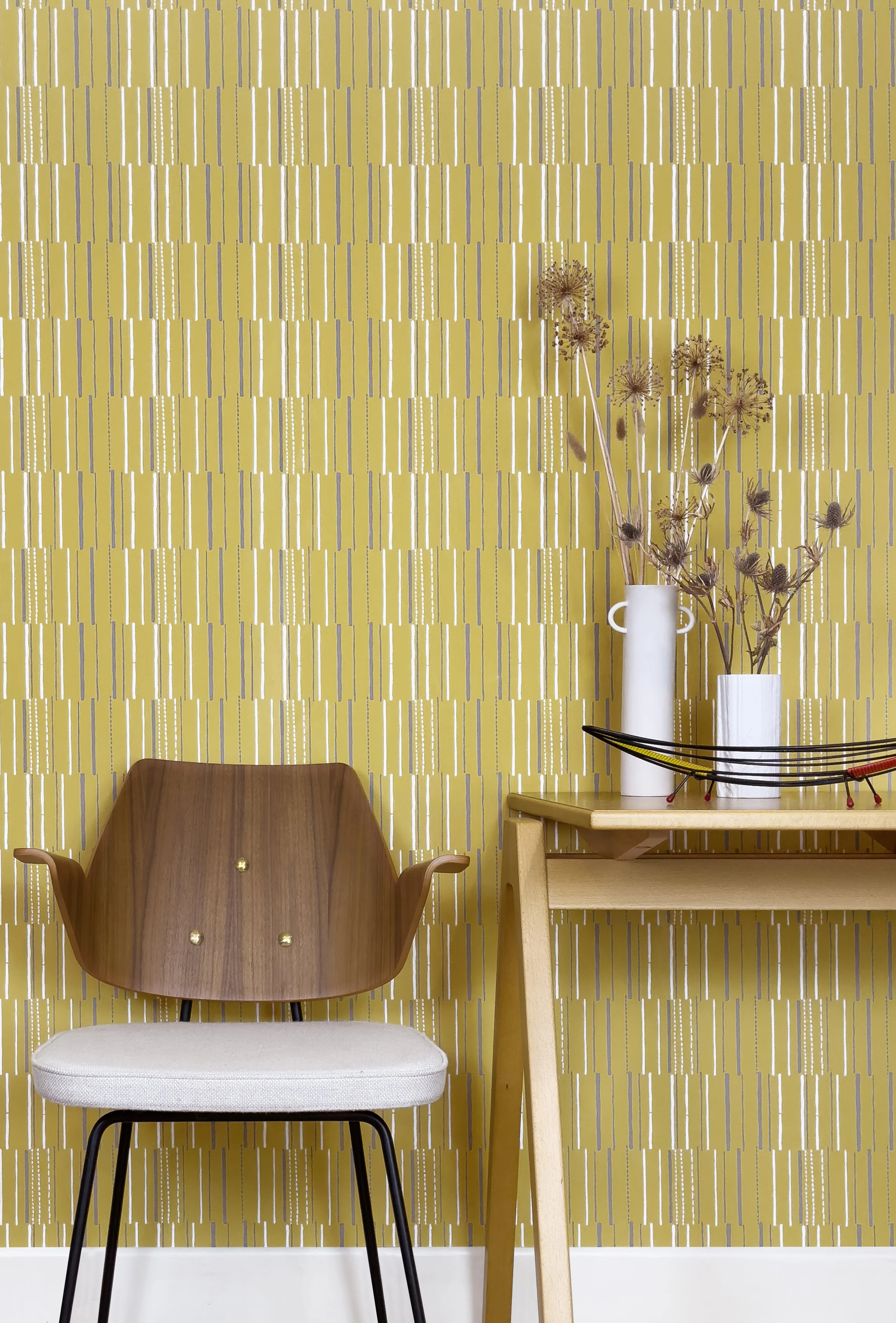 The original wallpaper was hand block printed by John Line and Sons for their Limited Editions 1951 collection. To emulate this technique would be difficult with any machine printing methods, so Mini Moderns collaborated with the Foundation to produce the design digitally, ensuring that Lucienne Day’s unique mark-making was reproduced as faithfully as possible, whilst losing none of the original’s quirks that resulted from block printing.